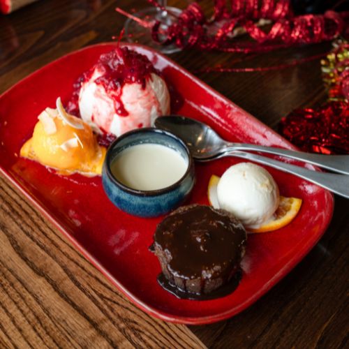 Too delicious to choose just one? Dive into this sharing plate! It features a taste of everything: sticky Christmas pudding, pavlova topped with berries, vanilla ice cream, and a zesty sorbet.